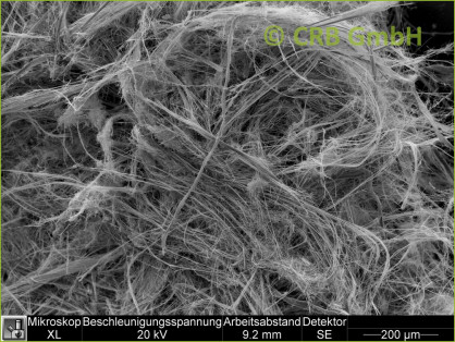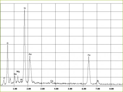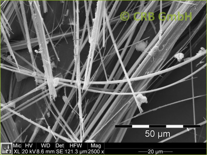 Identification d’amiante dans des produits en fibrociment par des images prises par un MEB et des spectres d’éléments dispersive en énergie.
